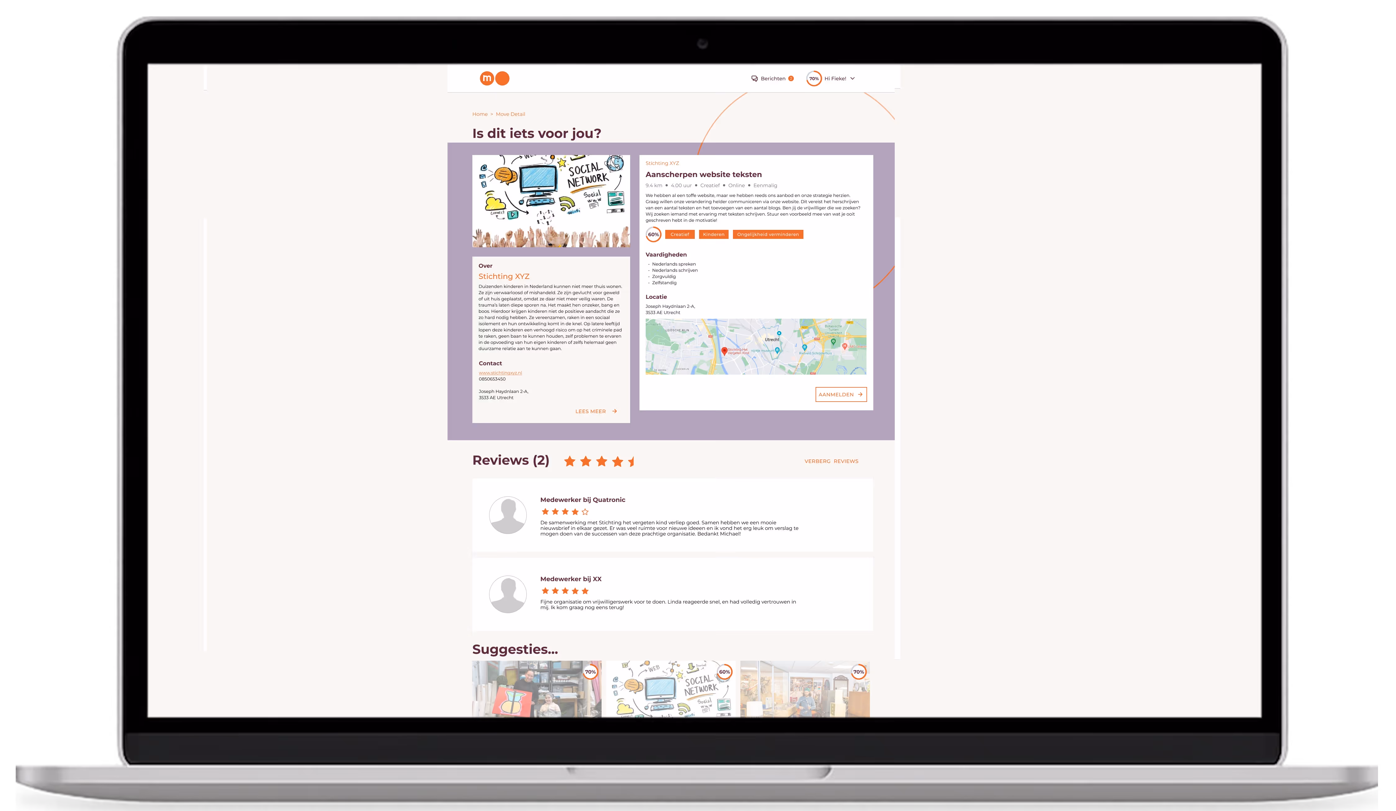 In slechts drie maanden tijd hebben we een matchingplatform opgeleverd dat de aanpak voor bedrijfs-vrijwilligerswerk volledig heeft gemoderniseerd. Het platform heeft een duidelijke positionering in de markt, en ondersteunt een groeiend netwerk van gebruikers en vrijwilligerskansen. Daarnaast sluit aan bij het business model van MO the movement.
