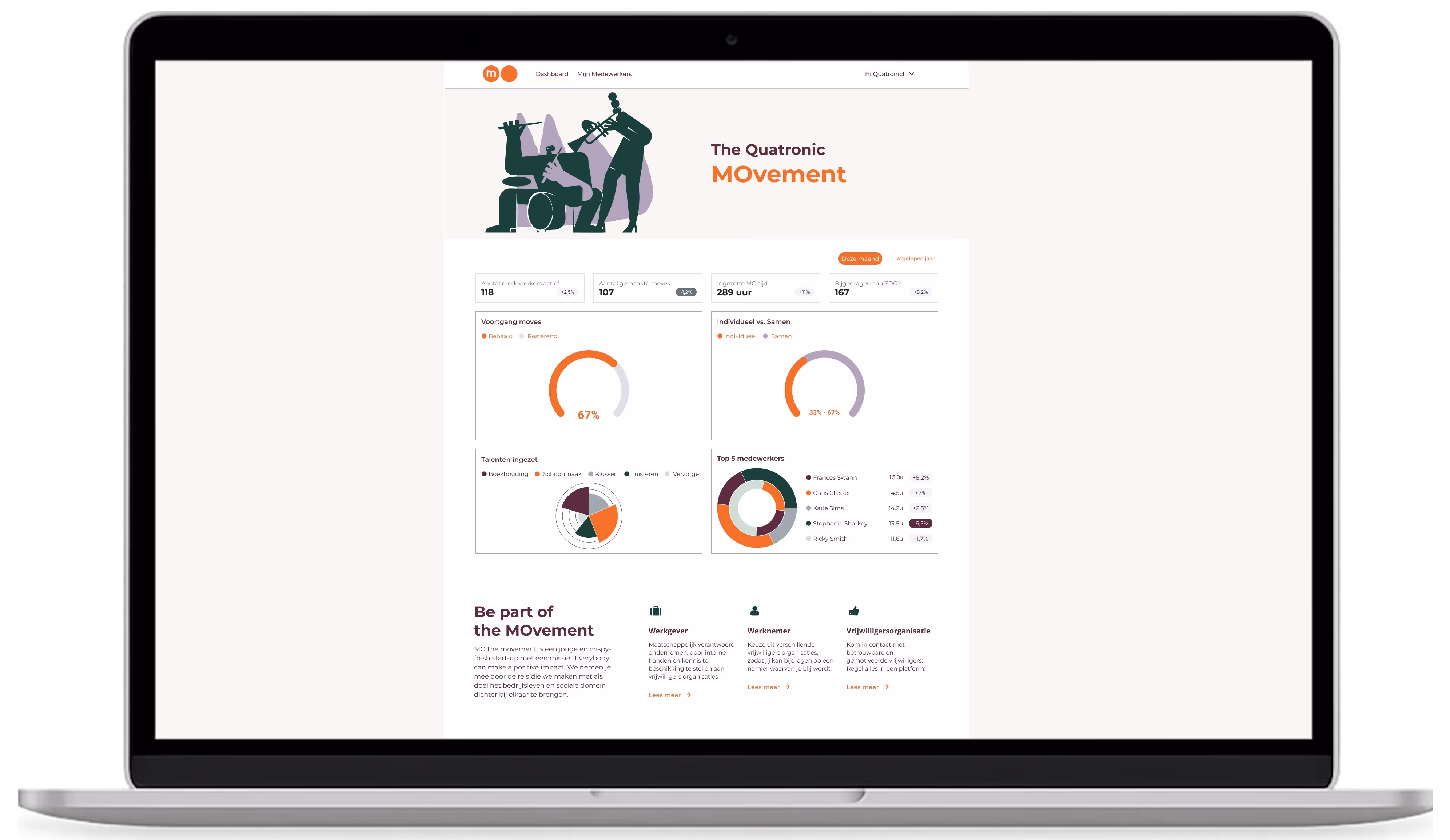 Via MO the movement krijgen werknemers de mogelijkheid om een deel van hun werktijd te besteden aan maatschappelijke projecten of goede doelen. Door bedrijven te verbinden met vrijwilligerskansen, krijgen werknemers de tijd en ruimte om bij te dragen aan een maatschappelijk doel dat hen aanspreekt. Tegelijkertijd wordt de maatschappelijke verantwoordelijkheid van de bedrijven bevorderd en inzichtelijk gemaakt.